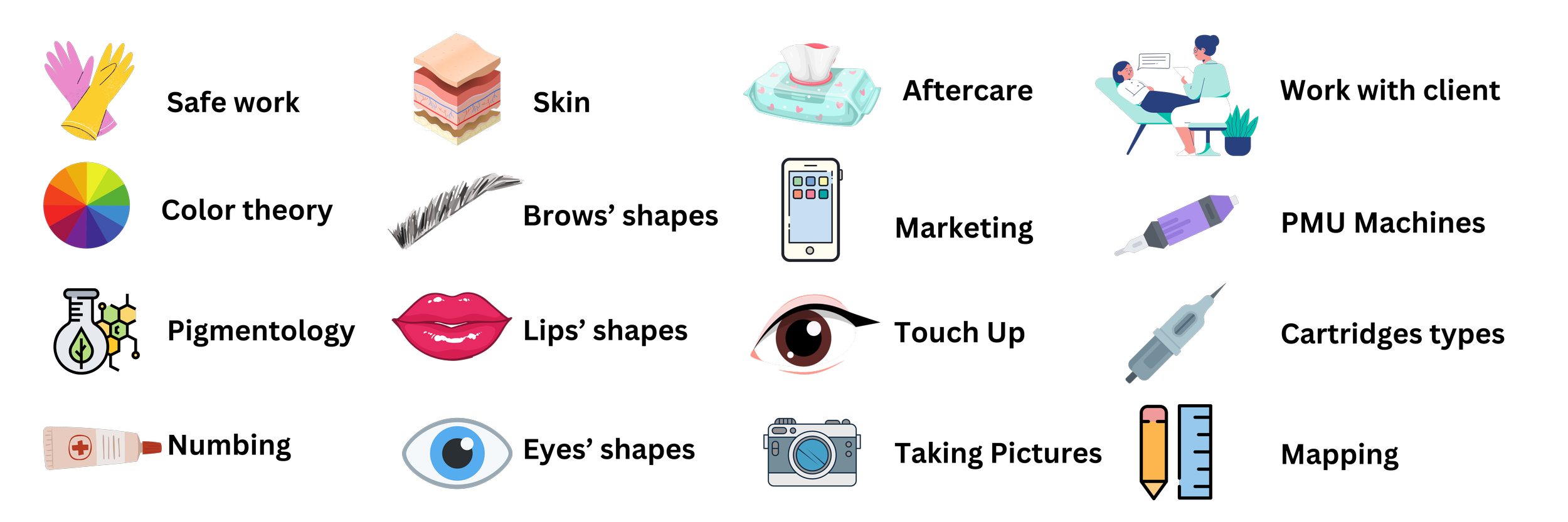 Basic PMU Course 3 days: 3 areas: Lips (+dark lips neutralization), Brows, Lashes; 3 models for demonstration and practice. PRO PMU Kit: Machine, 10 basic pigments, Booklet and Notebook are included.